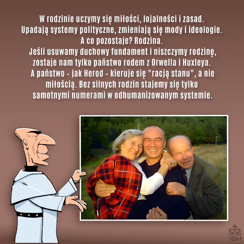 I nie łudźmy się. Wydaje nam się, że współczesny świat nie może się obejść bez rodziny, a różne futurologiczne przewidywania pokazują, jak straszny może być świat bez rodziny. Wystarczy sięgnąć do Huxleya, wystarczy sięgnąć do Orwella, żeby zobaczyć nienormalność całej sytuacji, patologię, totalitaryzm. Czy będzie to naszym udziałem, czy nie? Wszystko na razie wskazuje na to, że zobojętnieliśmy wobec tak palących i ważnych spraw, jaką jest rodzina, w której wszyscy się rozwijamy.